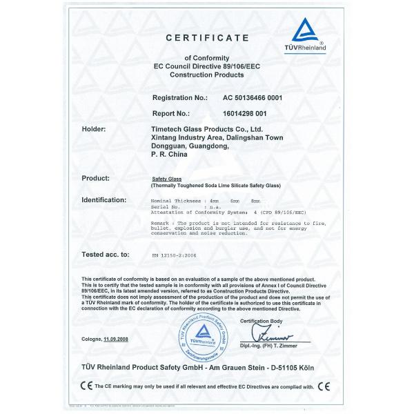 Timetech Glass strictly adheres to the ISO9001:2000 and Chinese Safety Glass Compulsory Certification(CCC) standards. We pass standard of U.K BS6206, CE EN12150, ANSI Z97.1-2009, AS/NZS2208 and own the certificates.